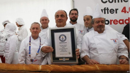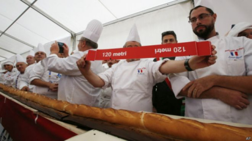 據(jù)悉,這個(gè)法式長棍面包是由60名面包師,辛苦工作將近7個(gè)小時(shí)完成的。