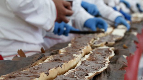 之后,面包師將長棍兒切成過百段,涂上榛子巧克力醬,送給在場見證的觀眾分享。